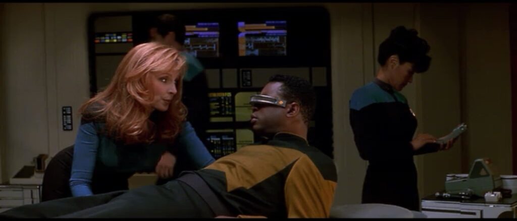 Geordi’s visor is sending a full HD video signal that is not only able to penetrate the many, many decks of the Enterprise-D, her shields, and deal with all the electromagnetic interference that is probably ricocheting all over engineering but is also likely encrypted. How in the name of fuck did none of the 19 extras that were wandering around the bridge throughout the movie fail to notice the signal? The ship has internal sensors. That’s how they were (earlier) able to tell Geordi and Data were not back on the ship!