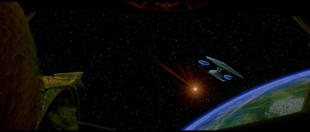 So I will give the movie a bit of leeway and assume the scene with the Klingons yelling about them cloaking after being ordered to target the bridge is going on at the same time as Riker’s angry-face “Fire.”.