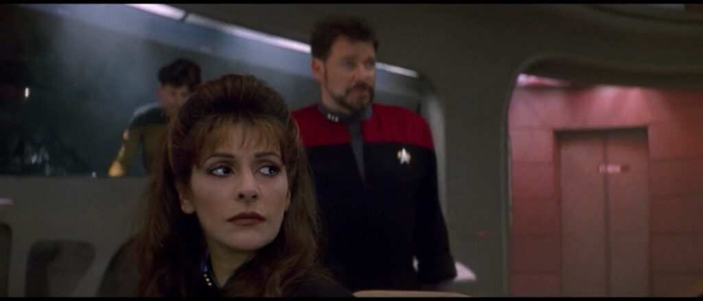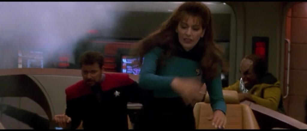 Riker orders Troi (the helmsman) to start evacuating everyone to the saucer section as they plan on separating. Okay, but why is Troi doing that? Shouldn’t she be working on driving? That seems more like an issue best suited for security, though given Worf’s recent performance, he might misunderstand and only evacuate one person.