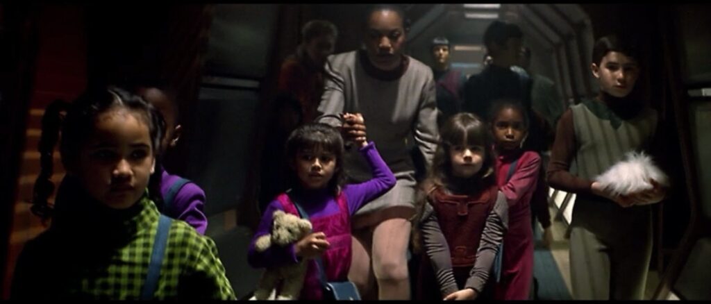 And in case you think for some reason that these people are NOT in the drive section and being moved upwards, Geordi finds some kids that for some reason, somehow, have lost their parents and orders another engineer to take them to a Jeffries Tube (basically, an access ladder).