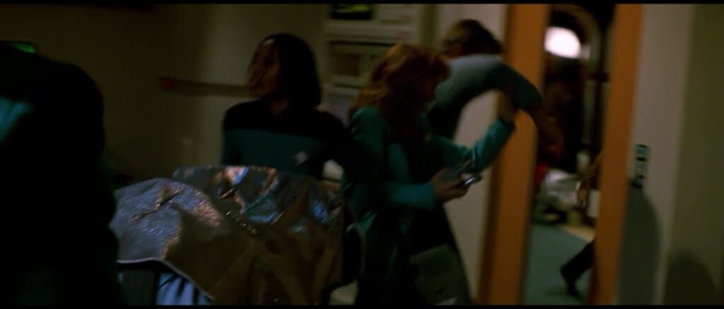 Also in the saucer section – main sickbay. This makes me wonder where in hell Crusher is taking these people. I can’t imagine anywhere she is taking them is any safer than sickbay, especially at this point as they didn’t yet know they were about to nose dive into a planet.