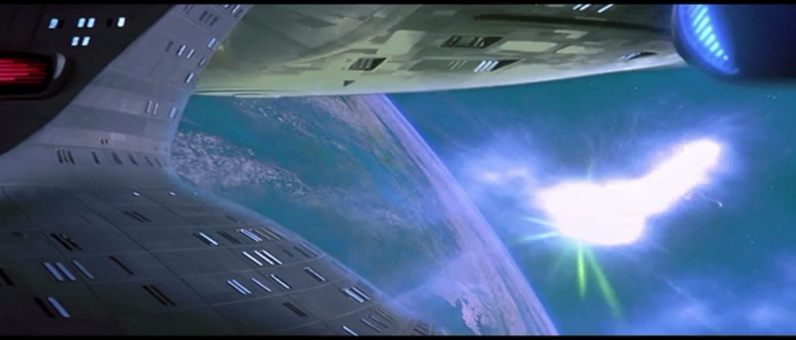 The (exteriors of the) crash sequence were pretty awesome. ILM did a great job with it – the whole thing was done with models (this was still before Trek totally switched to CGI). The crash was an inspiration for me in some of my writing and to this day I think it’s probably one of the most epic scenes in all of Trek lore.