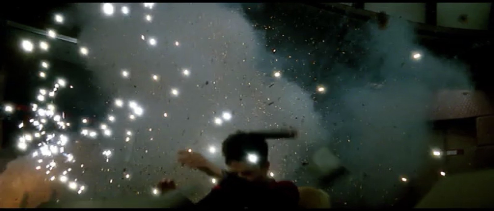 The BoP fires a disruptor shot that nails the port side of the drive section of the Enterprise. As a result, there is this HUGE explosion on the starboard side of the bridge that sends extras flying as if Michael Bay suddenly took over directing duties.