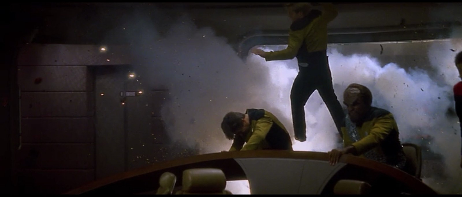 These explosions also caused fires. Normally on a starship, a fire is extinguished by a force field going up around it and all the oxygen burning out, causing the fire to kill itself. When the Enterprise crashed, she lost power, so she had no force fields. The fires on the bridge burnt without remorse. Either no one thought to go find a fire extinguisher or there aren’t any (because, you know, technology). Just throwing it out there, but fire is the number one cause of death on a submarine. There are a lot of similarities between a starship and a submarine.